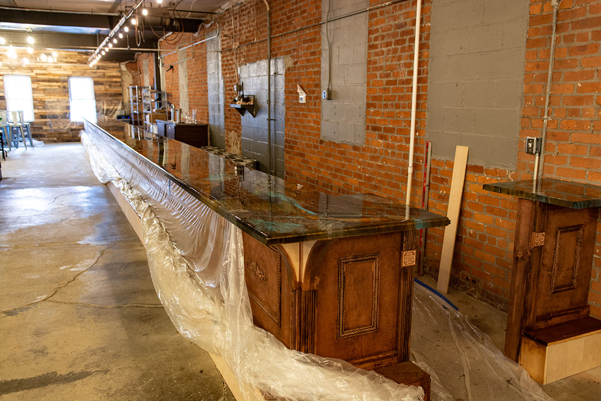 The high ceilings and openness of the main room lend itself perfectly to a 100’ long custom bar with a poured epoxy top.