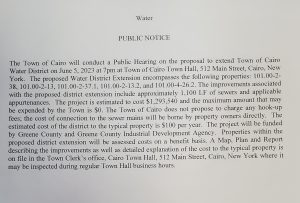 The Town of Cairo will be holding a Public Hearing on the proposal to extend the Town of Cairo Water District on June 5, 2023 at 7pm in the Town Hall Meeting Room.