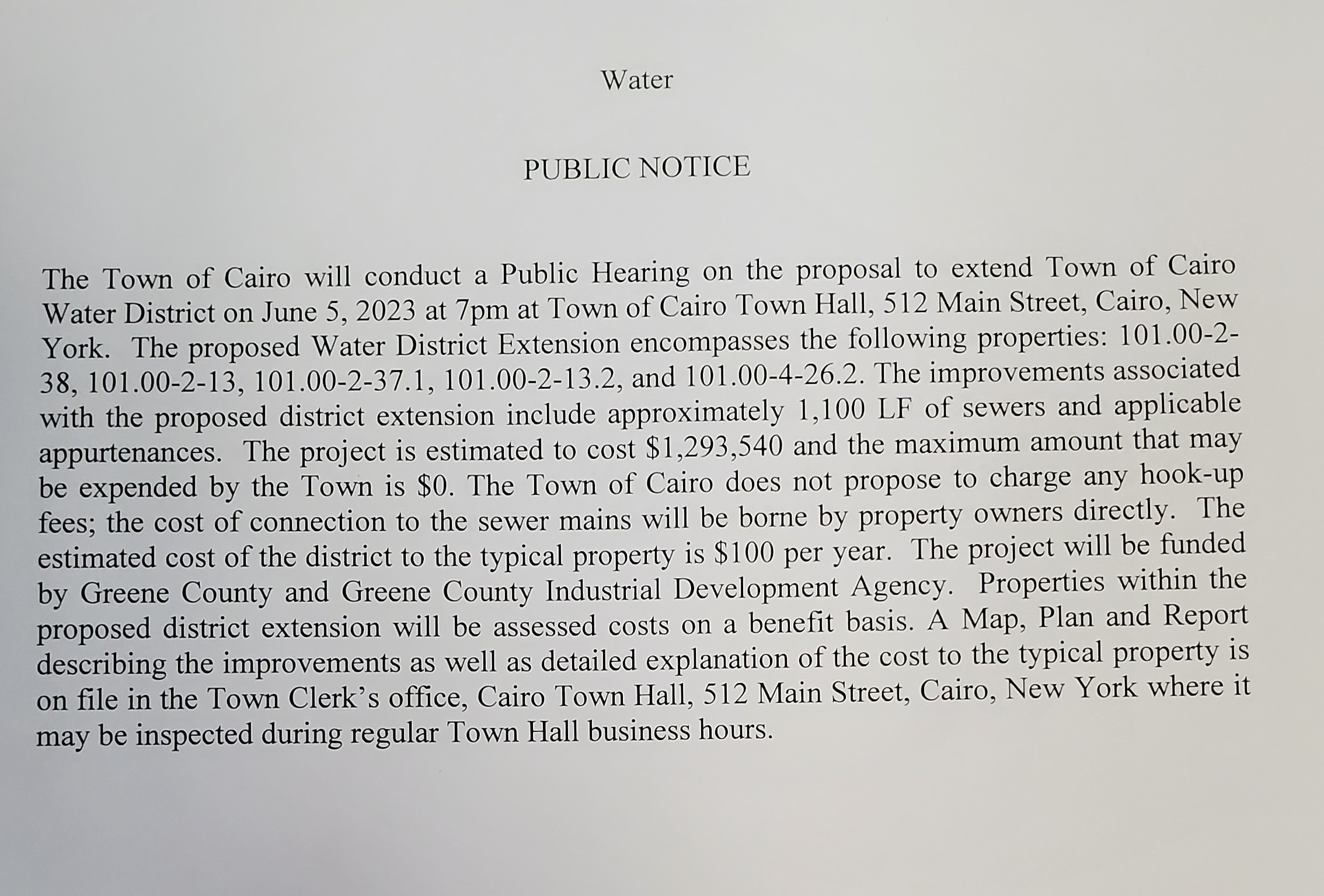 The Town of Cairo will be holding a Public Hearing on the proposal to extend the Town of Cairo Water District on June 5, 2023 at 7pm in the Town Hall Meeting Room.