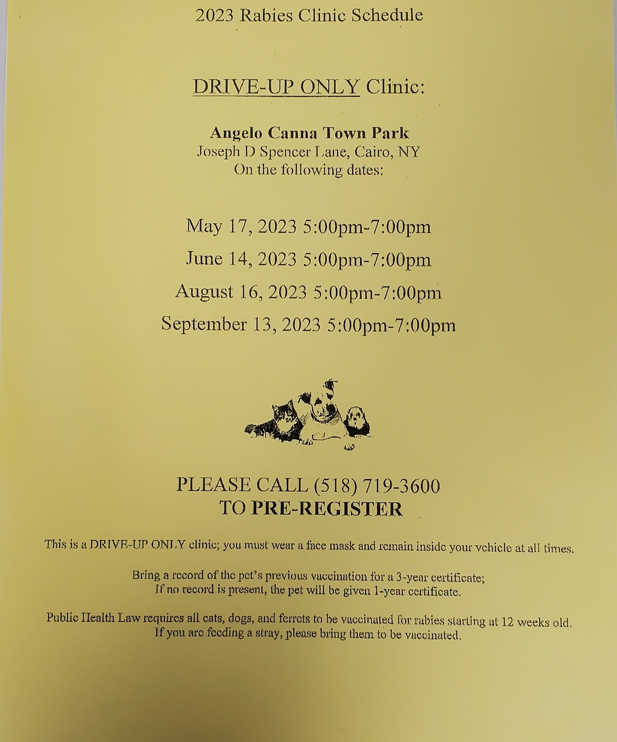 Due to inclement weather, the rabies clinic that was scheduled for tonight, June 14th has been postponed to June 21st, next Wednesday.