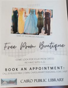 Need a Prom Dress? Call or visit the Cairo Public Library to book and appointment.