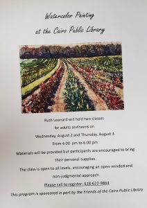 The Friends of the Cairo Public Library are hosting Watercolor Painting Classes at the Cairo Public Library on August 2, 2023 and August 3, 2023 from 4-6 PM. Call to Register : 518-622-9864.